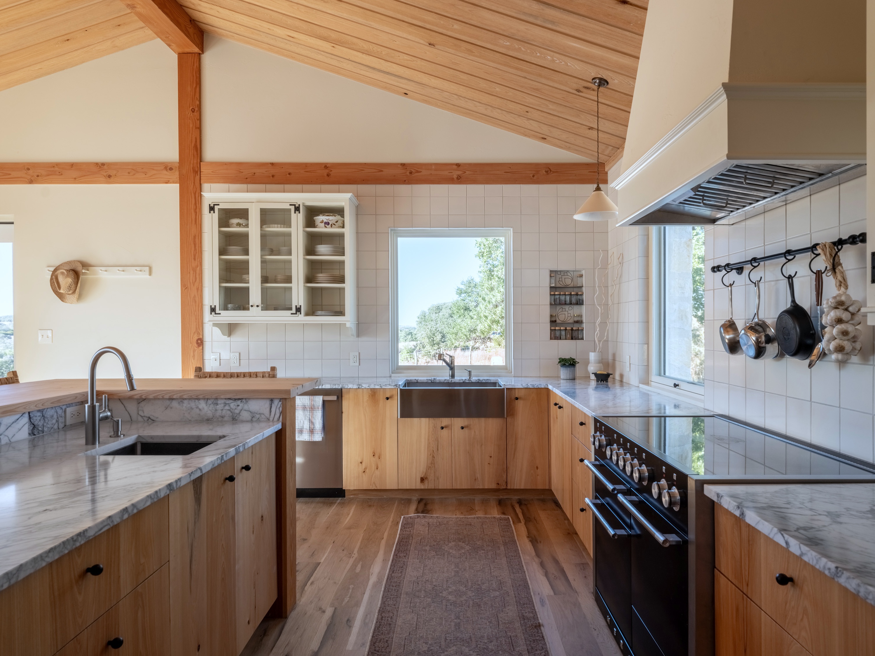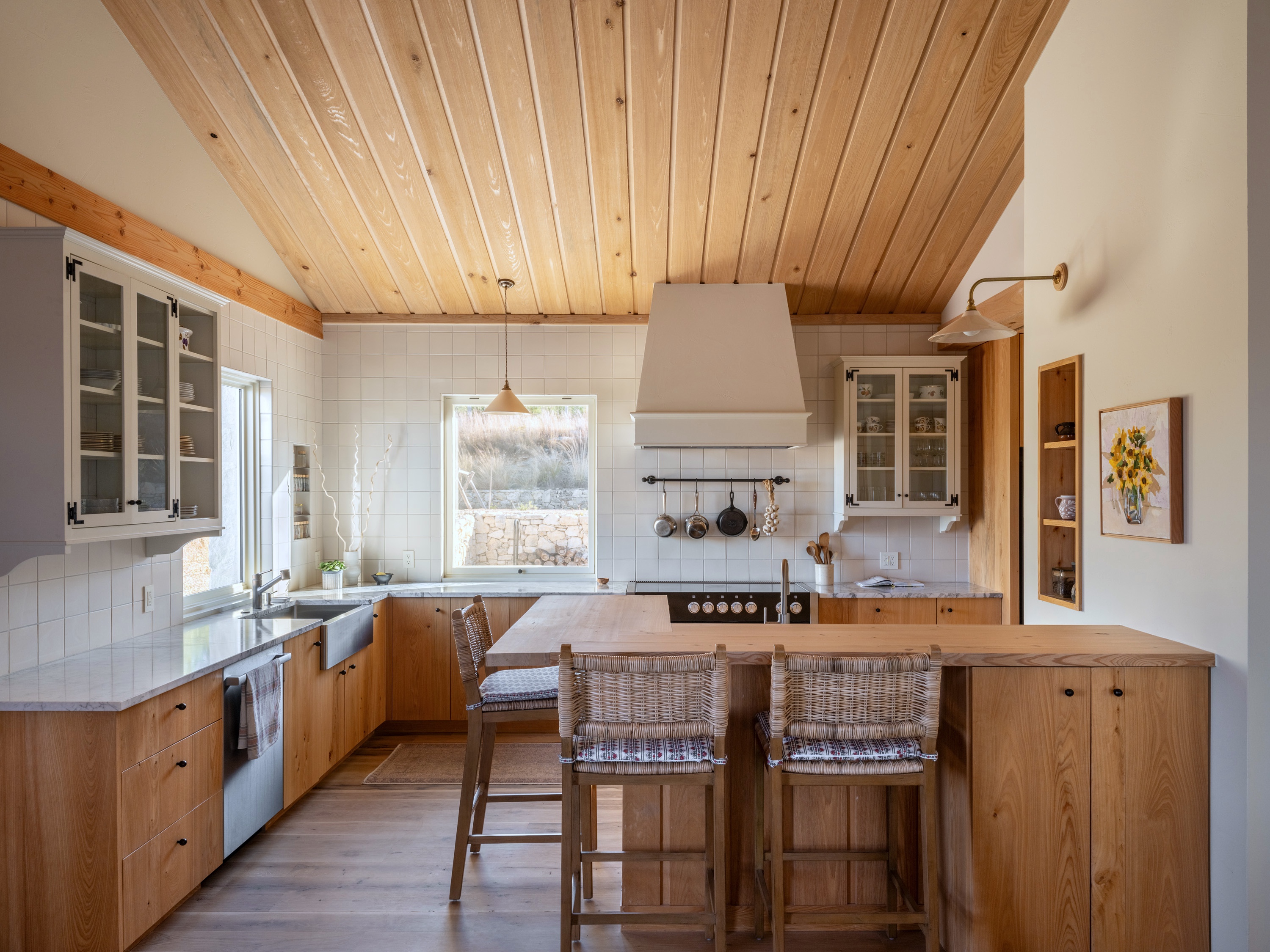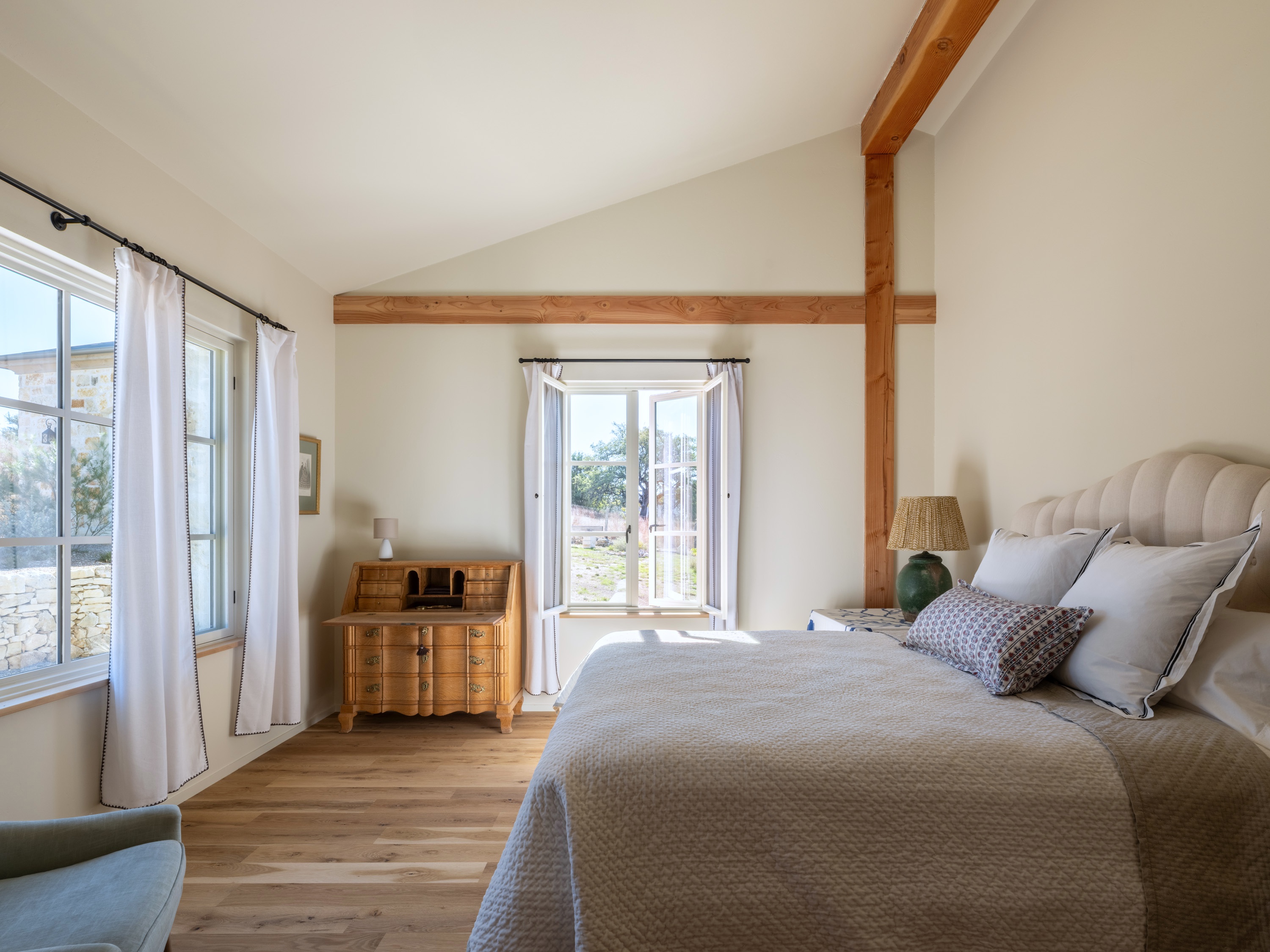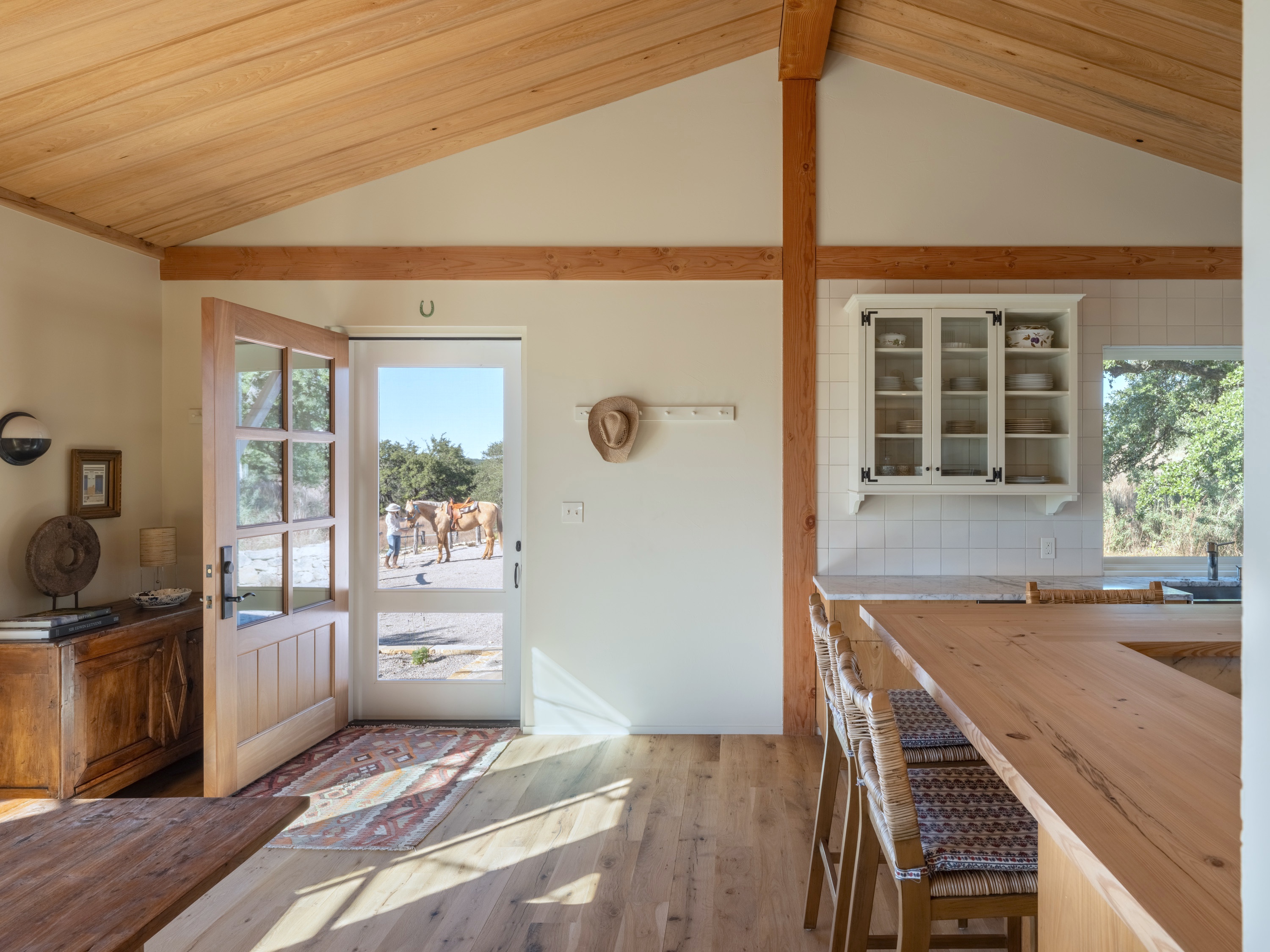 The main residence, at 1584 square feet, pairs heirloom-quality construction with high-end finishes, and includes an expansive primary suite, dressing room with built-in daybed, chef’s kitchen and pantry, and living and dining areas to host many guests. An authentic wood-burning stove encourages nights around the fire. A terrace with steel trellis expands the living toward the west for sunset views across the pasture.