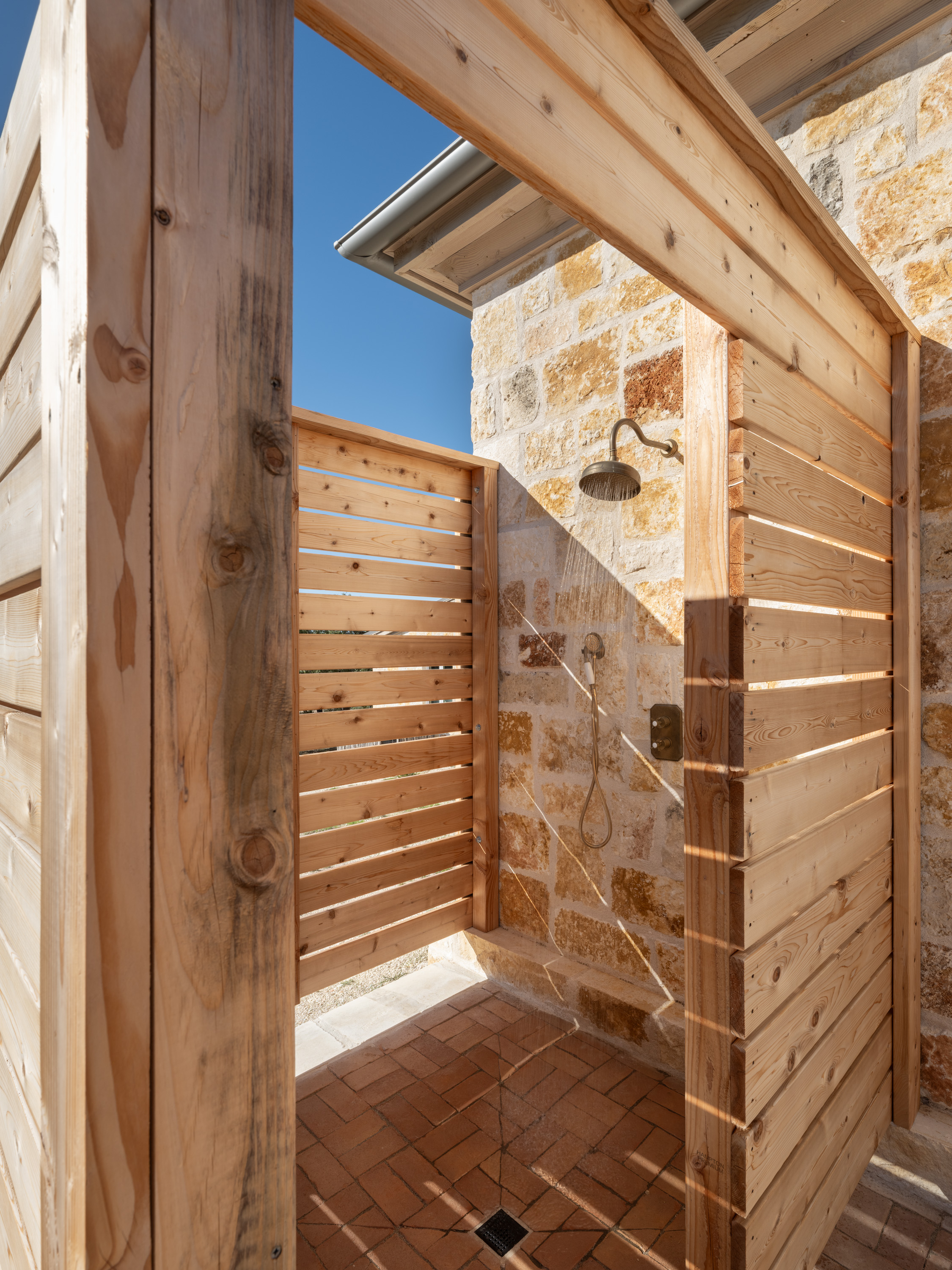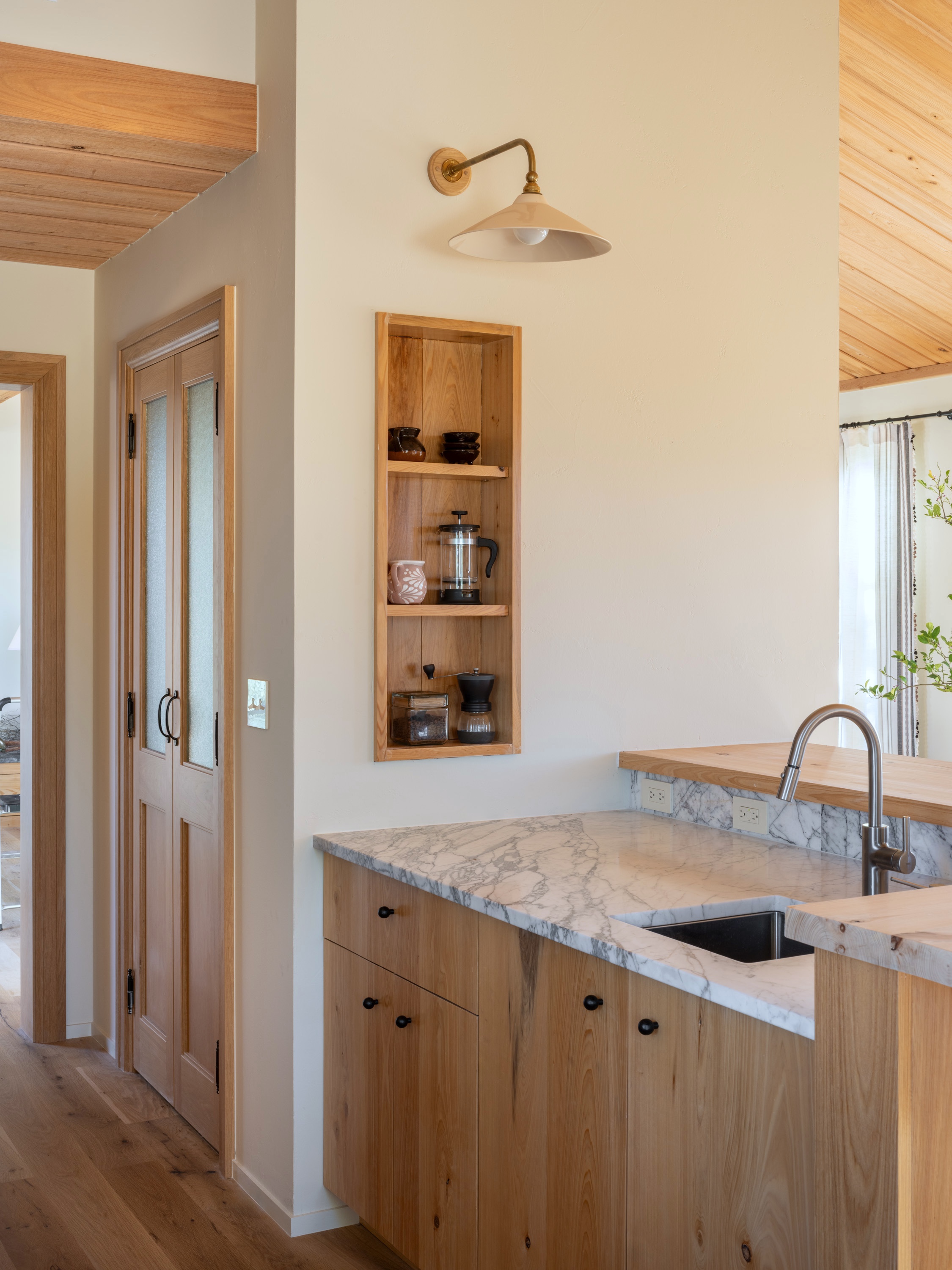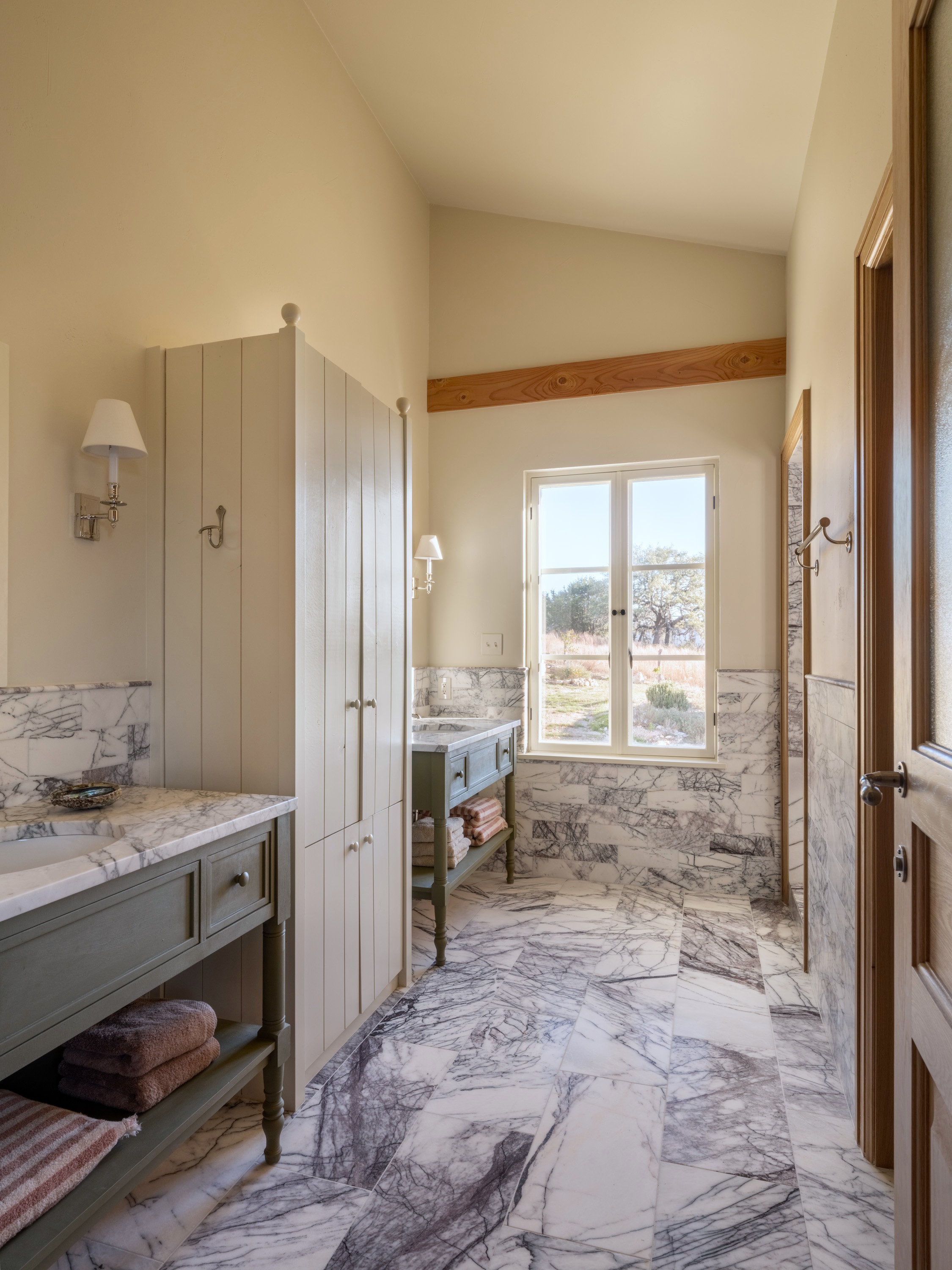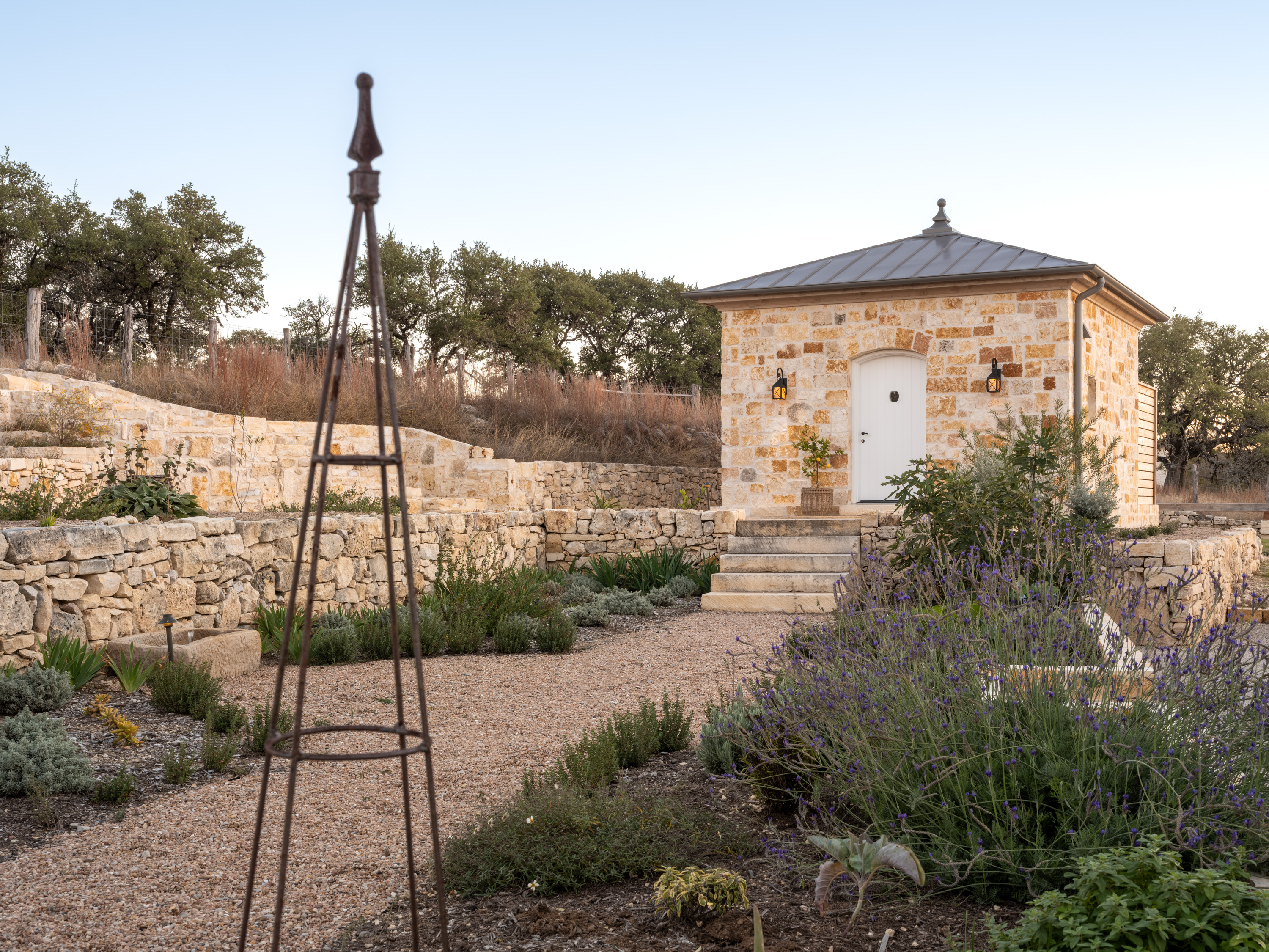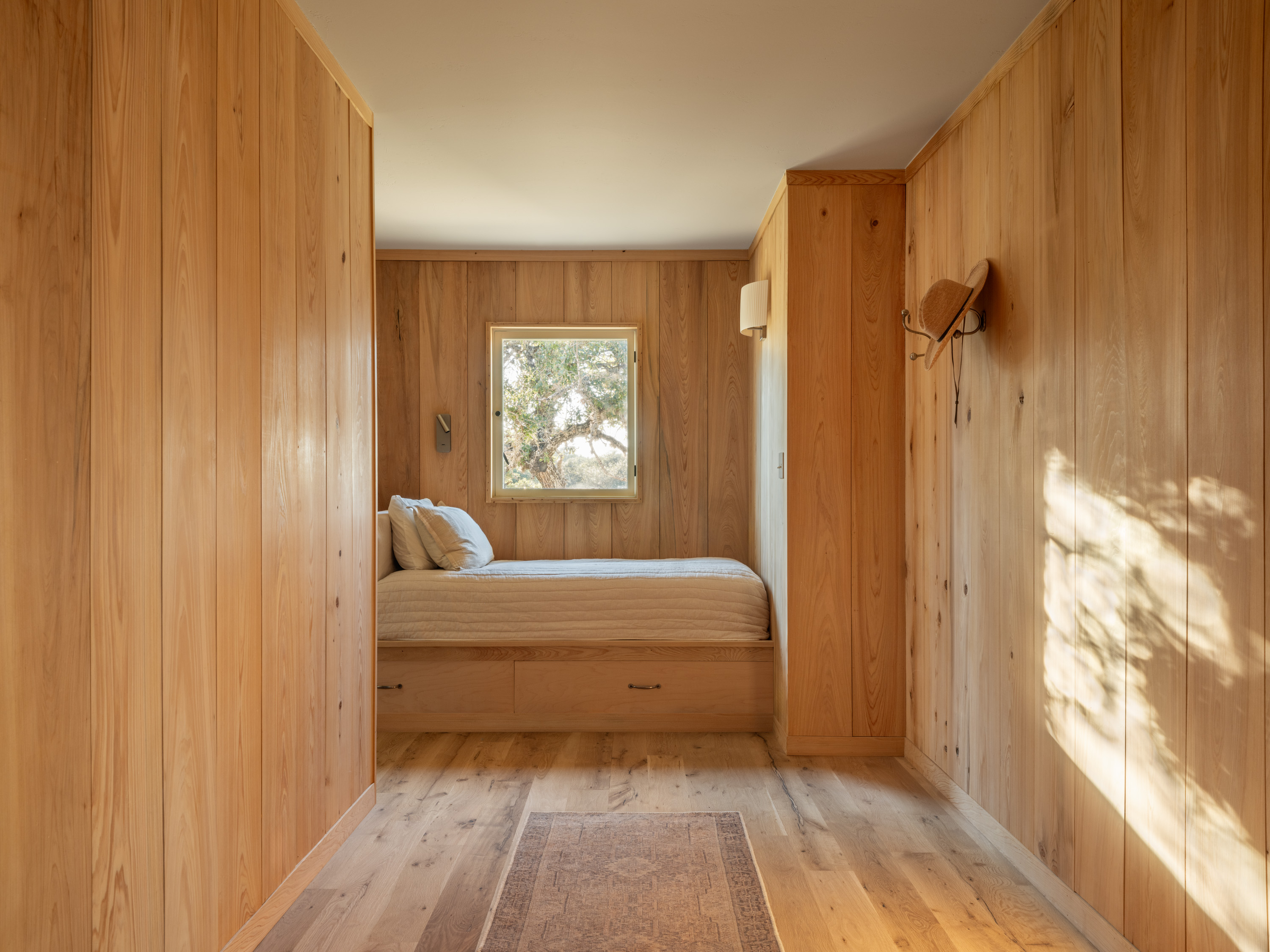The main residence, at 1584 square feet, pairs heirloom-quality construction with high-end finishes, and includes an expansive primary suite, dressing room with built-in daybed, chef’s kitchen and pantry, and living and dining areas to host many guests. An authentic wood-burning stove encourages nights around the fire. A terrace with steel trellis expands the living toward the west for sunset views across the pasture.