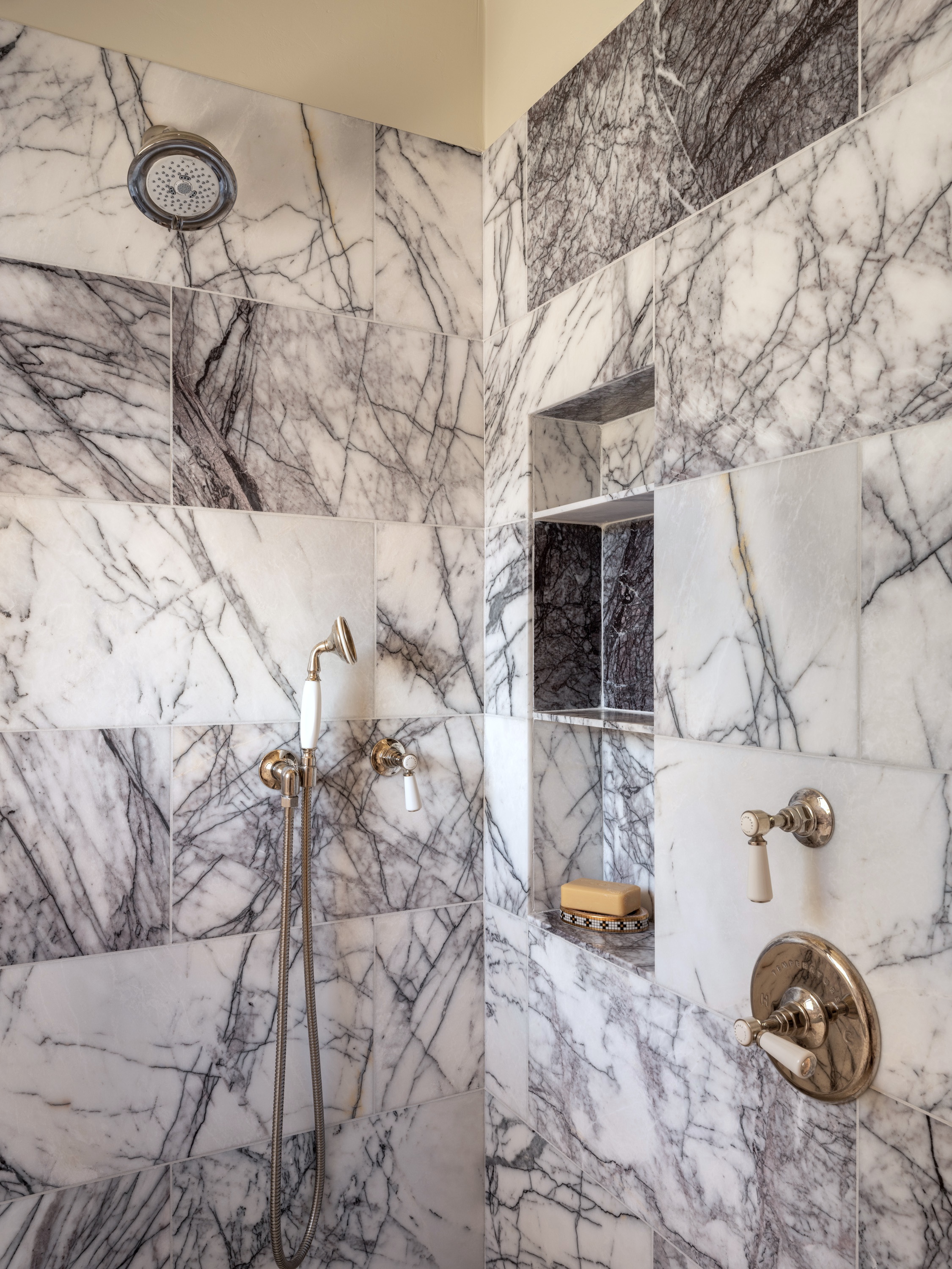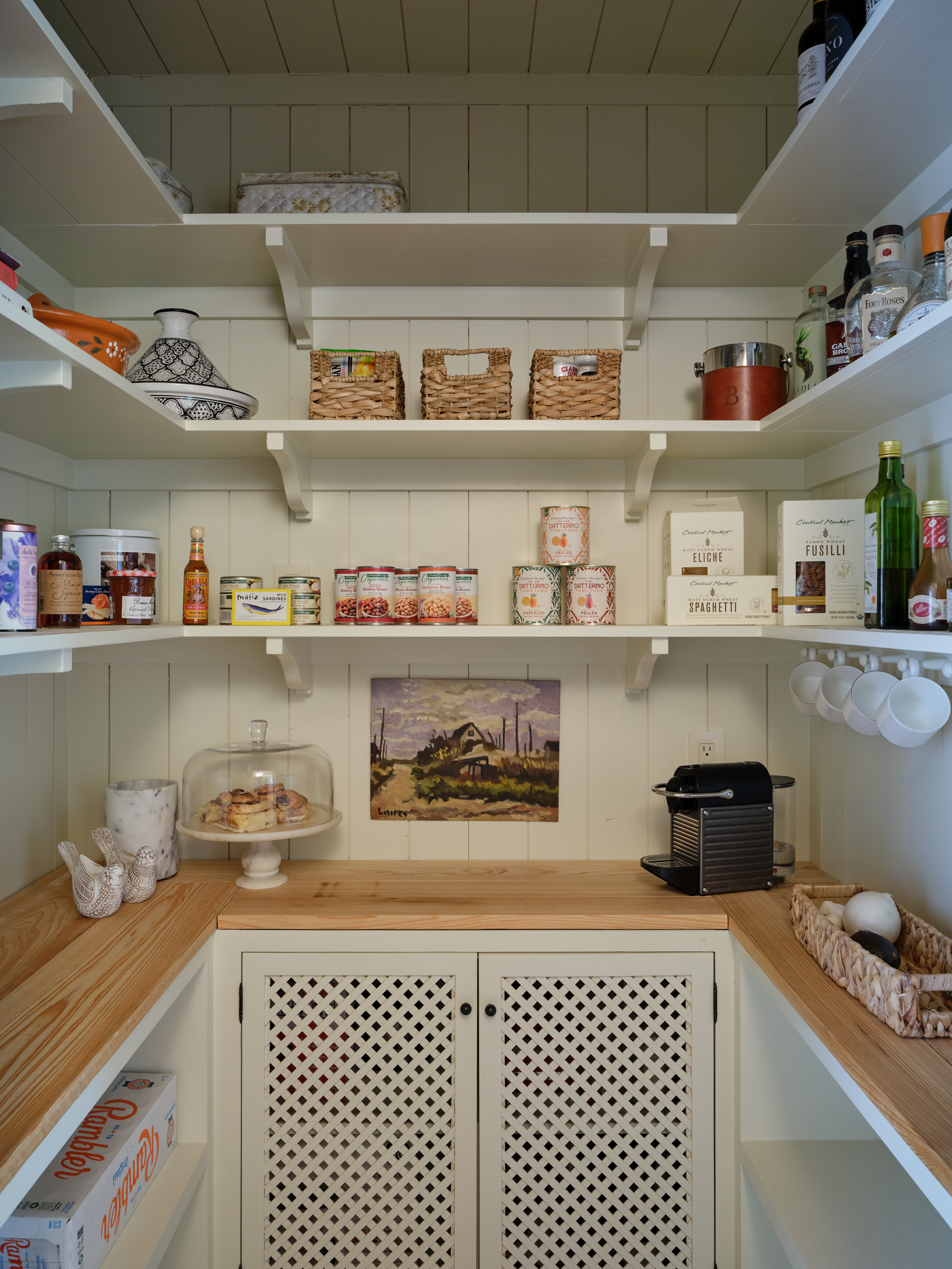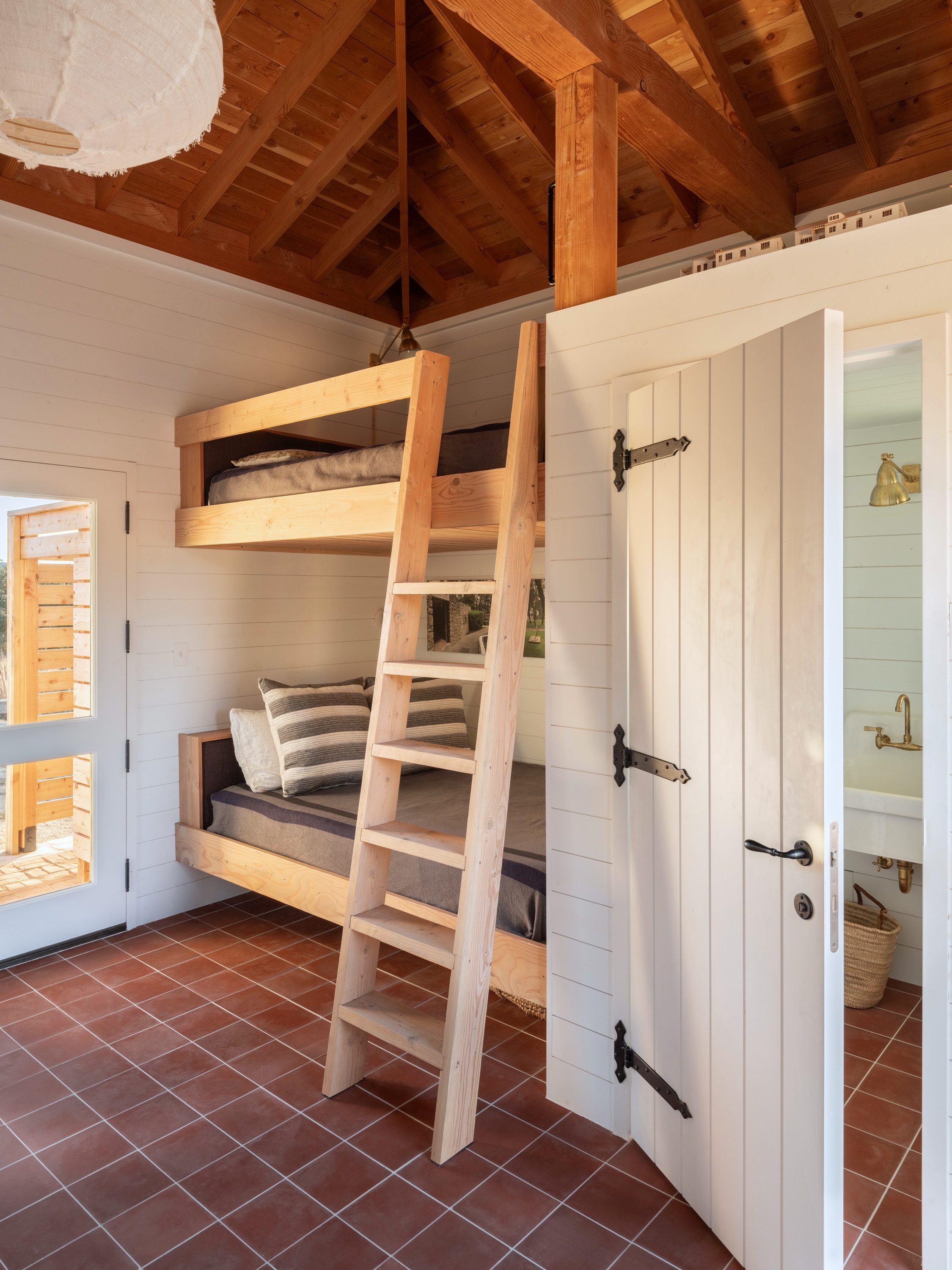 Sited within the garden is a charming 324 square foot detached studio. Guests are accommodated with a built-in double queen bunk, half bath and outdoor shower. The studio interior has shiplap board walls and a timber-framed vaulted ceiling, and offers work-from-home possibility with a built-in desk and storage loft.