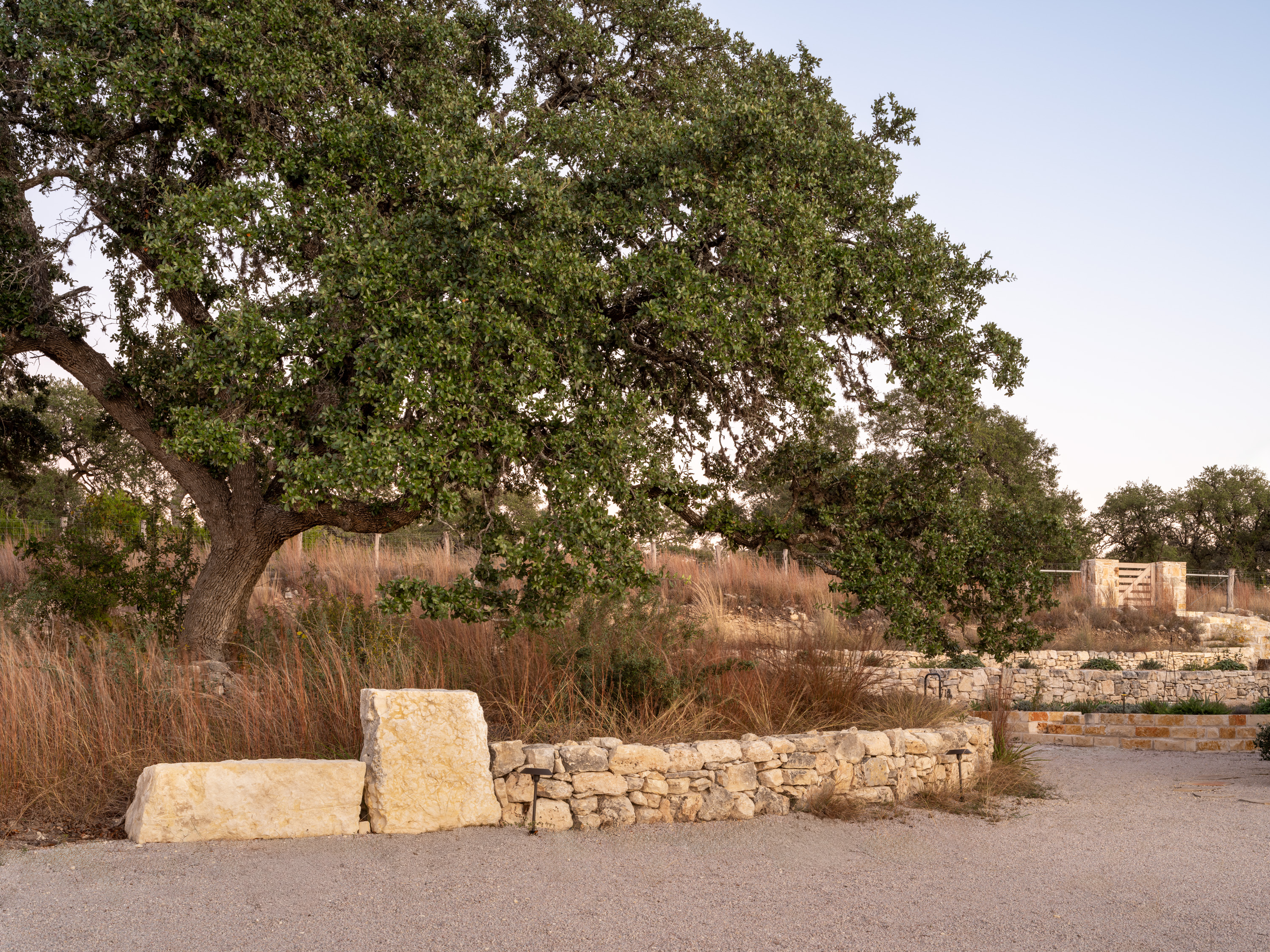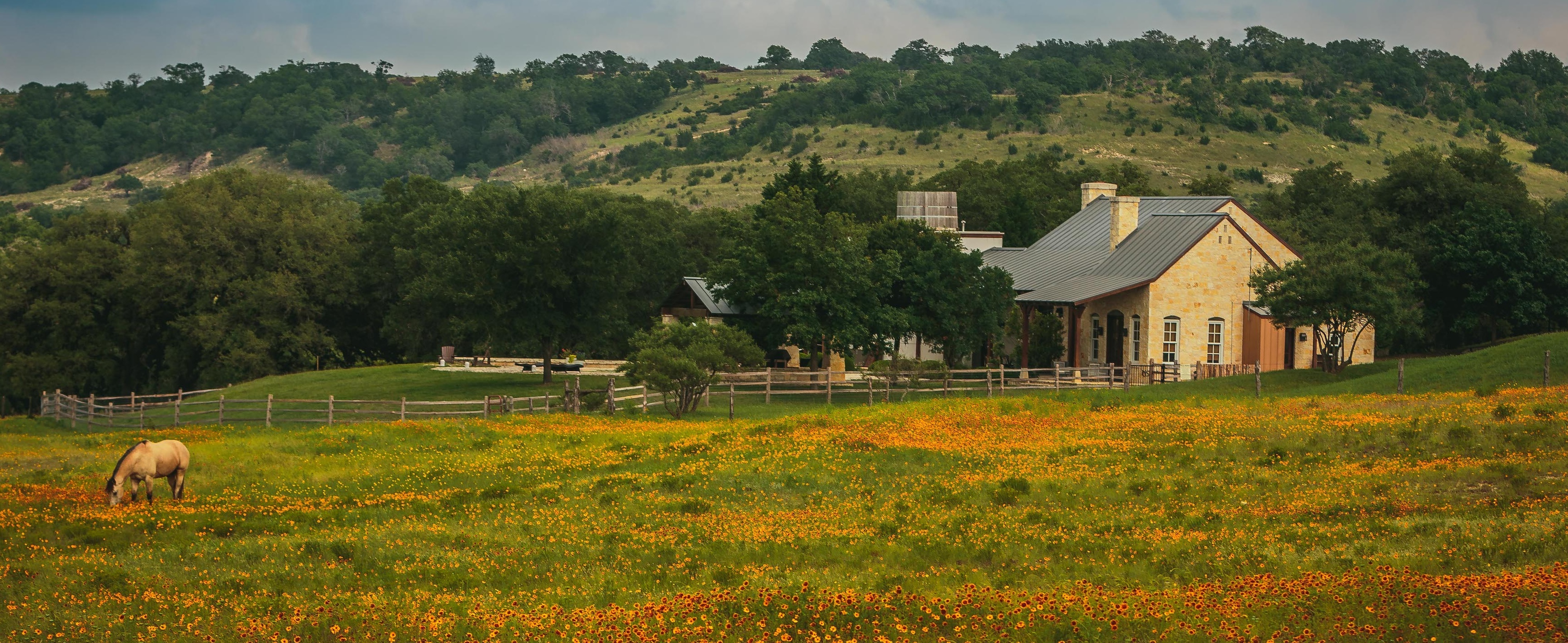 A pastoral country home in The Preserve at Walnut Springs in Johnson City, Texas, thoughtfully designed by Rick & Cindy Black Architects for durability and comfort in the hill country. Sited on 7 acres, the homesite includes a main house and detached studio, with stone garden walls and 1-acre fence enclosure.